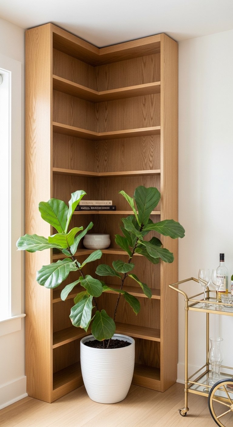 • Large floor plant: A tall fiddle leaf fig or snake plant fills the corner beautifully