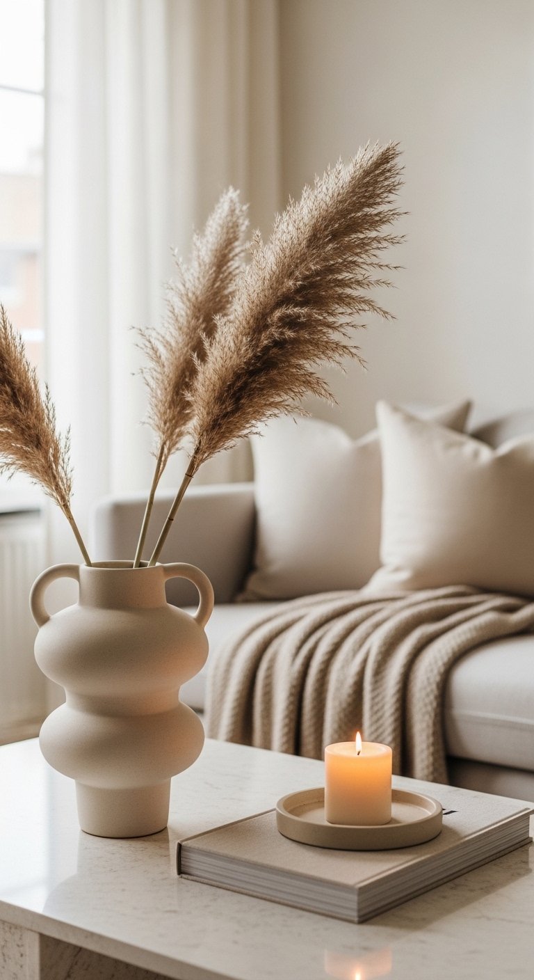 A single large ceramic vase beats six small ones. One quality throw blanket beats three cheap ones folded awkwardly. Quality over quantity applies nowhere more powerfully than in small apartment living rooms.