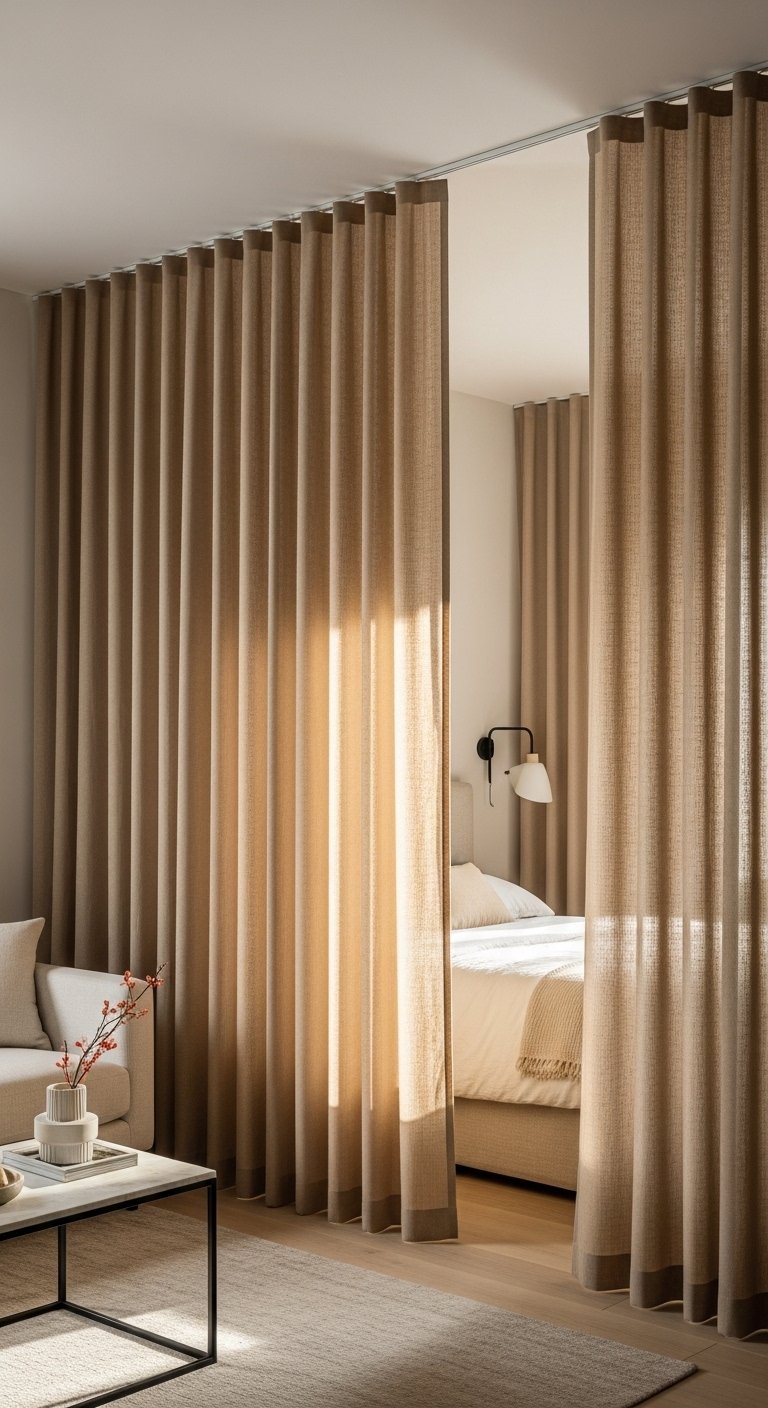 Sheer curtains allow light to pass through while suggesting a boundary. Heavier linen or velvet curtains provide genuine visual and acoustic separation. Both approaches cost a fraction of any structural solution and can be reconfigured whenever your needs change.